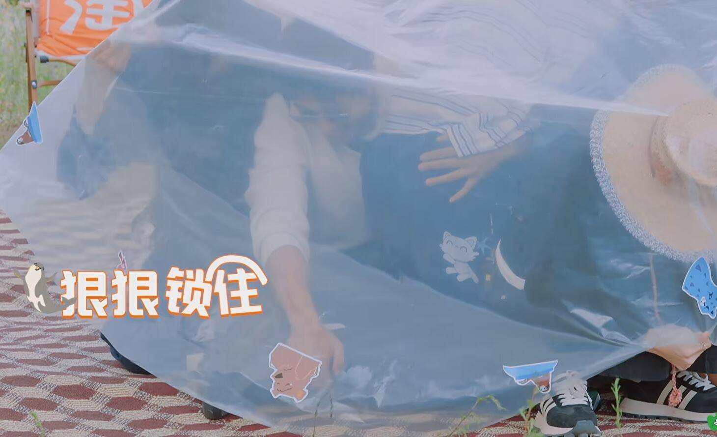 黄景瑜钻进塑料布之后,看到旁边的白敬亭腿在外面,二话不说就用武力值把白敬亭的腿掰到了塑料布里面。